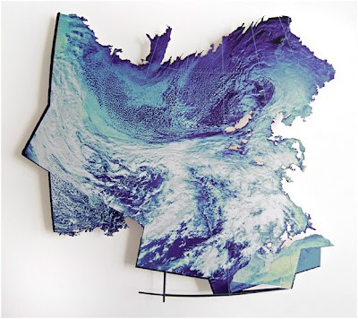 Borders and edges are of particular importance to printmakers and Clark’s more recent work plays around with this element. His 2011 ‘Skyshapes’ series, consists of assembled weather satellite scans printed on delineated MDF supports which seem to be floating off the wall. He is currently pushing this idea further still by meticulously creating fictitious islands constructed from pieces of Scottish islands. With these he intends to explore climatic change by showing the relationship between the land and the elements.