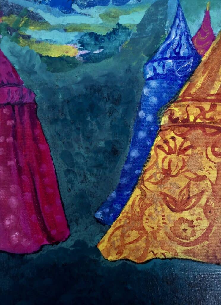 This painting prompted imaginative discussion about the tents being exotic, fascinating and colourful. One participant focused more on the composition, following the lines with his finger: ‘it goes down, along and up’. As with the response to the Midmar Allotments painting, the participants seemed to be entering the painting, moving and following. ‘You can go in there, through, up there, over there’