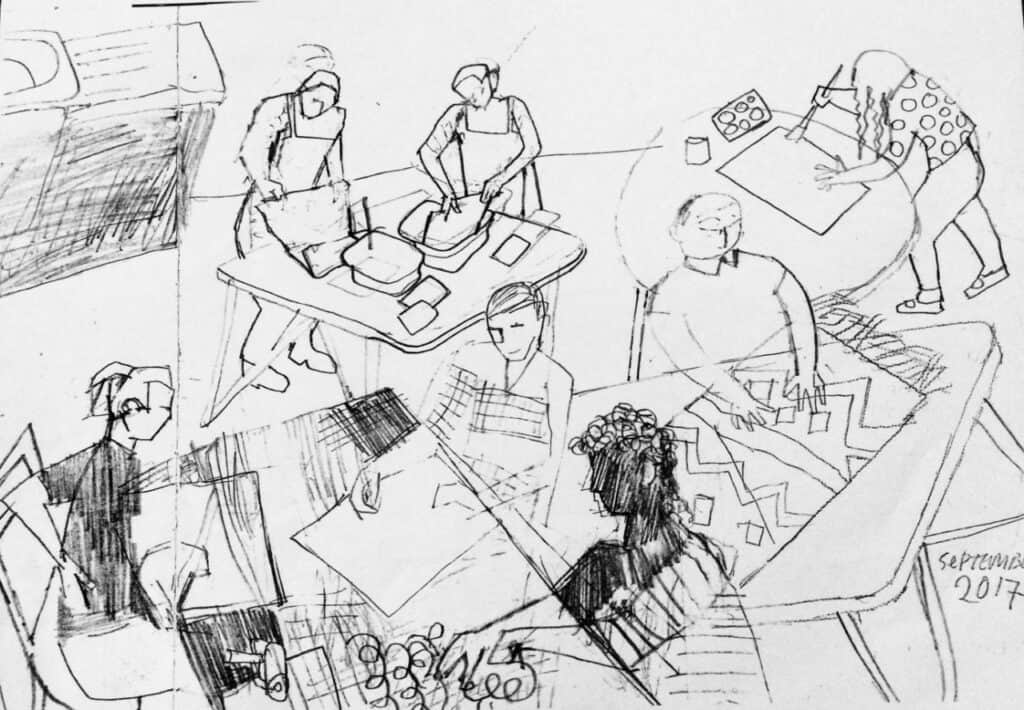 “I picked this one – I thought it was interesting – it’s got big bold lines and I like that it’s dark in the side …it’s kind of abstract…you don’t really know if they’re happy and dancing…I guess they are. I really like doing art but I never really have the time…it gives me the confidence to try new things …it’s good to come and see you guys every week.”