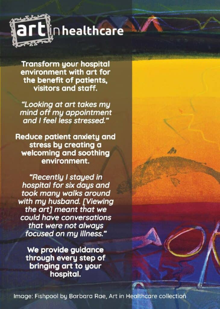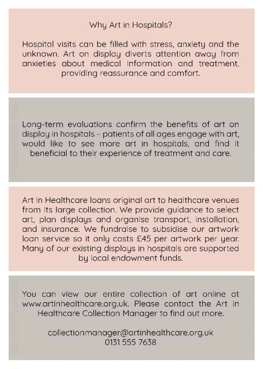 This is our new flyer for hospitals – we are keen to promote our artwork rental service in all parts of Scotland. The need for this service is extensive and we often find that it is one individual who works in a particular hospital service who takes the time to work with us to bring art into their area of the hospital. If transforming the hospital you work in is of interest please get in touch we can help you make it happen.