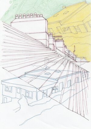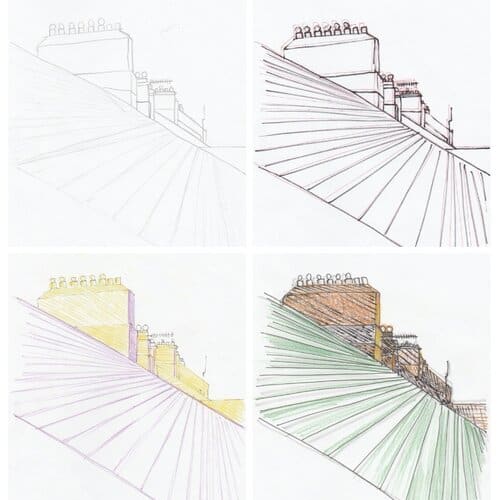 By standing at a window, facing outside and holding your drawing flat against it, with another piece of paper to redraw on top, you can make copies of your initial drawing. When redrawing these images, you can offset the lines between one drawing and the next. The extent of this can have quite a significant effect on the outcome and mixing different types of media, like pen and pencil, can also create interesting effects.