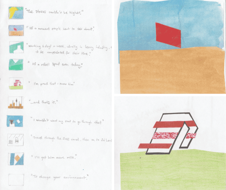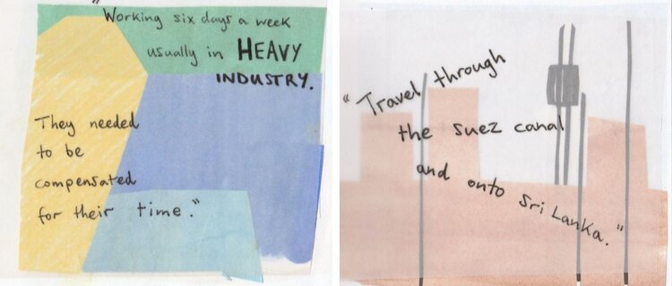 Using your initial small sketches, you could then use painted or recycled paper to create abstract collage pieces. Before sticking things down, consider their placement and think about the way the shapes interact when making adjustments. You might like to use tracing paper to write your quotes on so that they can be laid over the images without being permanent.
