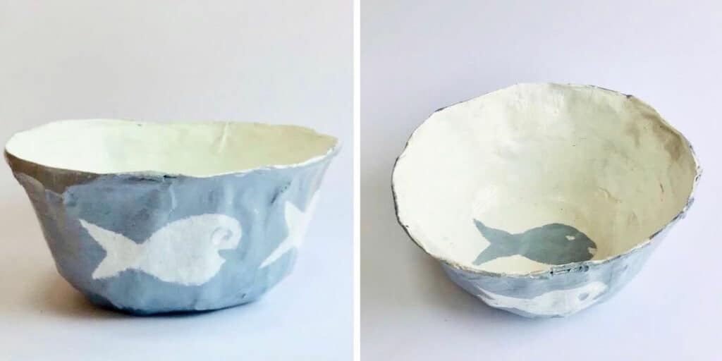 A metaphor for swimming about in the ‘sea of life’ during lockdown, and a play on words (fish swim in a glass bowl) I have made dishes out of papier-mâché – all is not as it seems, parodying statements issued in the media regards the virus.