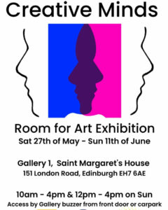 Title: CREATIVE MINDS A Room for Art exhibition Where: Gallery 1, 151 Saint Margaret’s House, London Road, EH7 6AE When: From Saturday 27th of May…